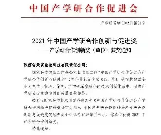 陜煤集團(tuán)網(wǎng)站:天芪生物公司榮獲2021年度中國(guó)產(chǎn)學(xué)研合作創(chuàng)新獎(jiǎng)