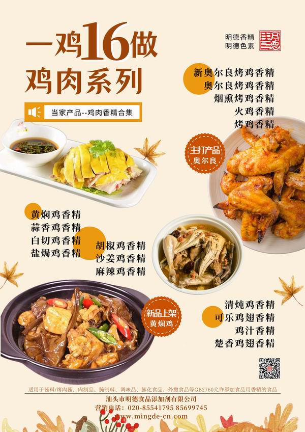 在雞肉香精領域我們潛心專研,結合市場潮流,消費者喜好,汕頭市明德食品添加劑有限公司現有以下16種雞肉相關風味的香精,供您選擇。并持續(xù)努力研發(fā)更多符合市場需求的風味。
