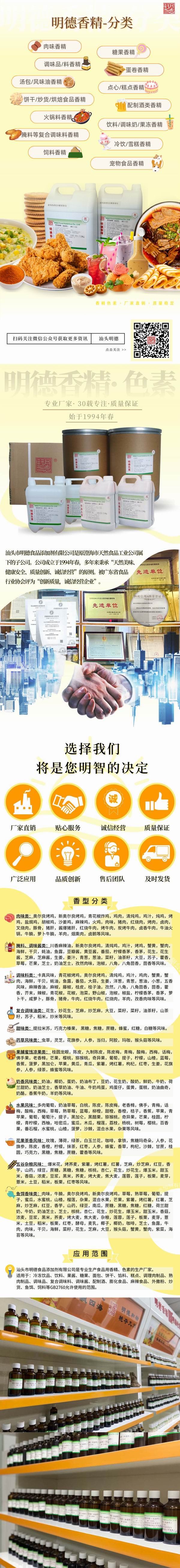 腌料、調(diào)味醬類:奧爾良烤雞、新奧爾良烤雞、清燉雞、雞汁、烤雞、蟹黃、蟹肉、海鮮、干貝、蠔油、魚露、豆瓣醬、黃豆醬、番茄、檸檬香茅、香茅、花生、花生醬、芝麻、芝麻醬、生姜、姜汁、青蔥、蔥油、菜籽、油茶籽、大豆、蘇子、紫蘇、藿香、草莓、芒果、芝士、奶油芝士、孜然肉味、泡椒、八角、八角茴香、茴香等風(fēng)味。